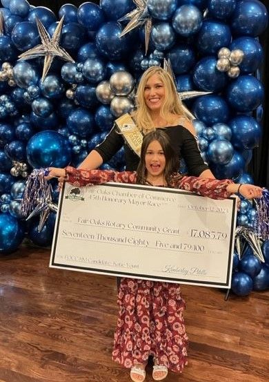 Katie raised a total of $34,171.58, with $17,085.79 donated to the Rotary Club of Fair Oaks Community Grant Program. The remaining funds will support the Fair Oaks Chamber of Commerce in funding scholarships and community events.
